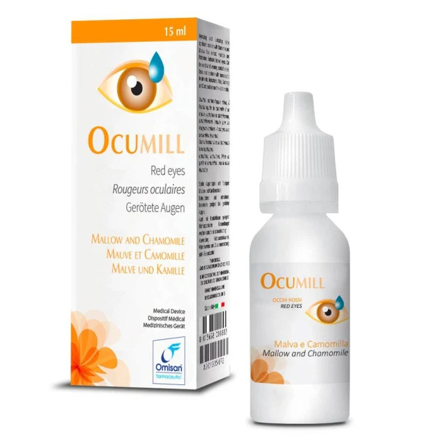 Chamomile (Camomilla matricaria) and mallow (Malva sylvestris) extract eye drops, also indicated in case of red eyes.